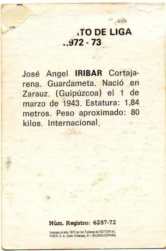 | Cromo de Iríbar. Athletic Club de Bilbao. Temporada 1972-73. Editorial Fher. Reverso. |